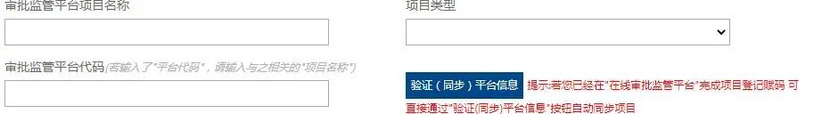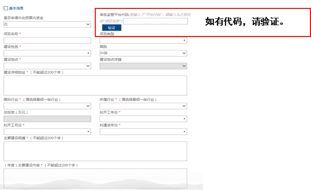 4. 审批监管平台代码:必须准确填写,并点“验证 ( 同步) 平台信息”。未填写项目代码,无法审核推送。