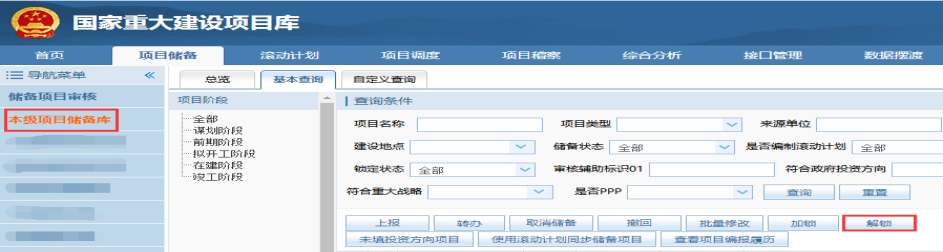 2.解锁更新已审核的项目,项目单位无法进行修改及撤回操作,项目单位提出解锁申请,上级部门同意后在“项目储备”的本级项目储备库进行解锁。