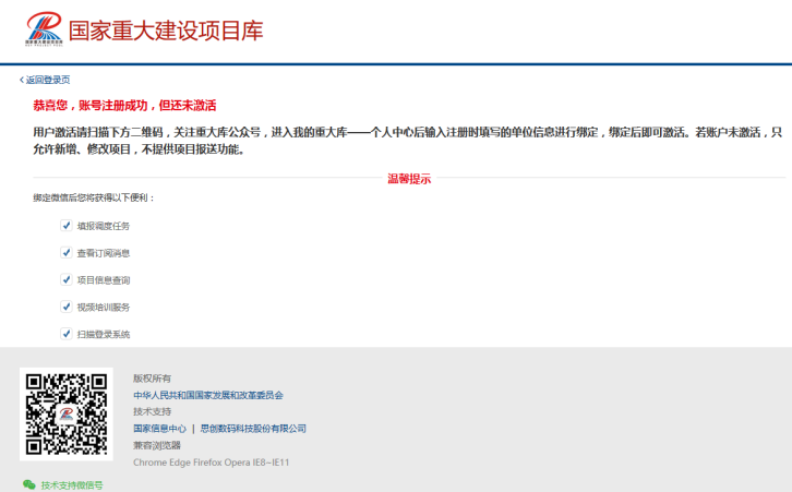 如收不到激活邮件不能激活,或收到激活邮件点击激活地址后提示激活失败。我们会定期(一般 30 分钟)统一激活所有账号。用户登录系统后,在右上角没有提示“您的账号未激活,重新激活”,则表示是已激活状态。未激活,不影响在填报区填写项目基本信息和投资情况,只是不能上报。