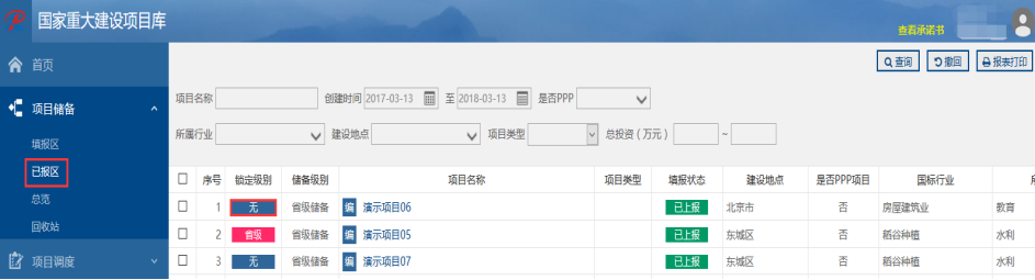 储备级别为空,表示该项目还未被纳入审核单位的项目库;储备级别为“省”、“市”、“县”时,代表该项目已经纳入了相应级别审核单位的项目库中。