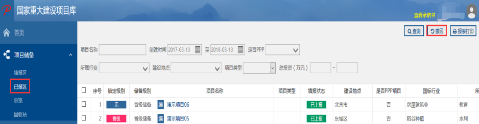 1.撤回更新未审核的项目,项目单位可在已报区撤回。