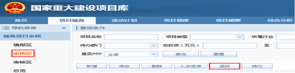 已审核的项目还可通过提出退回申请,将本级储备库的项目退回至项目储备审核的审核区,在审核区将项目退回至申报单位。