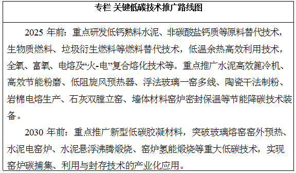10. 加快研发重大关键低碳技术。突破水泥悬浮沸腾煅烧、玻璃熔窑窑外预热、窑炉氢能煅烧等重大低碳技术。研发大型玻璃熔窑大功率“火-电”复合熔化,以及全氧、富氧、电熔等工业窑炉节能降耗技术。加快突破建材窑炉碳捕集、利用与封存技术,加强与二氧化碳化学利用、地质利用和生物利用产业链的协同合作,建设一批标杆引领项目。探索开展负排放应用可行性研究。加大低温余热高效利用技术研发推广力度。加快气凝胶材料研发和推广应用。(工业和信息化部、国家发展改革委、科技部、生态环境部按职责分工负责)