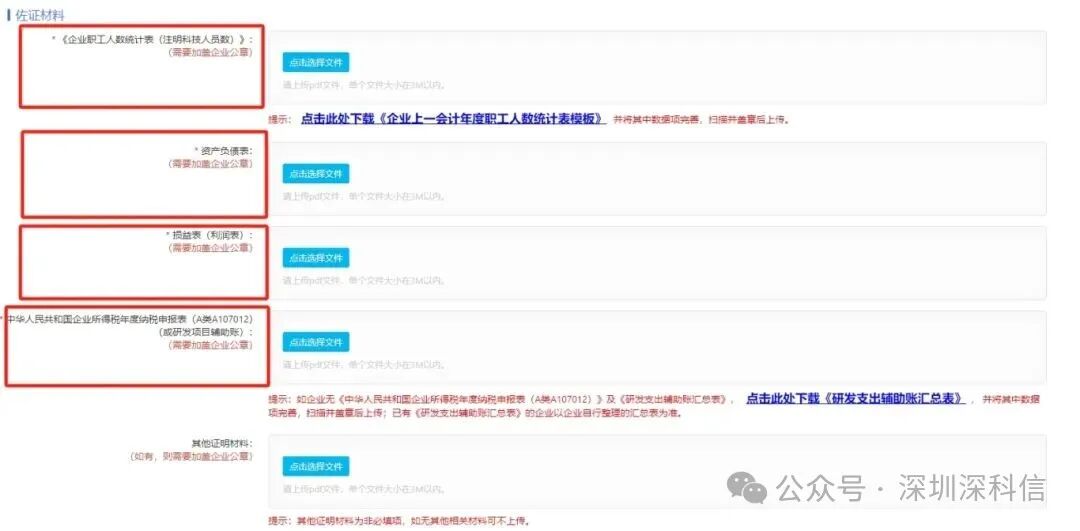 备注:“如企业无《中华人民共和国企业所得税年度纳税申报表(A类A107012)》及《研发支出辅助账汇总表》, 可下载系统中《研发支出辅助账汇总表》(下载后查看是2021版), 并将其中数据项完善,扫描并盖章后上传。欢迎咨询深科信