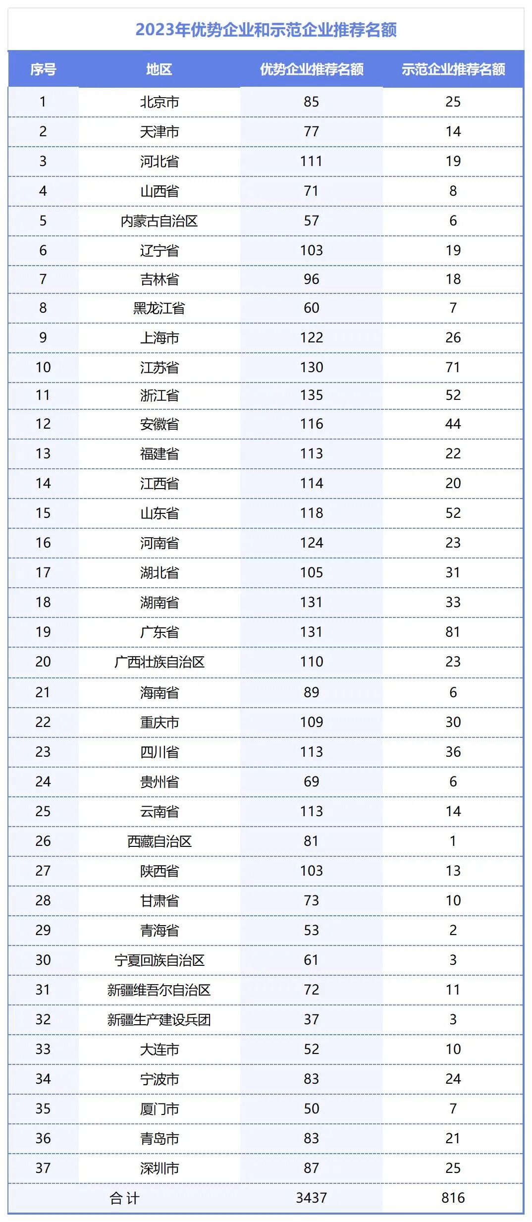 2023年度,在地方层面,针对优势企业与示范企业的认定,每地区严格控制数量,其中优势企业认定名额上限超过100家省份为18个,其中江苏、浙江、湖南、广东等省份名额超过130家,示范企业认定按照分配名额。以山东为例: