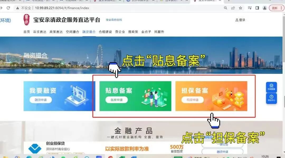 申报主体可登录宝安区亲清政企服务直达平台(https://qqzq.baoan.gov.cn),进入融资撮合板块,点击“贴息备案”
