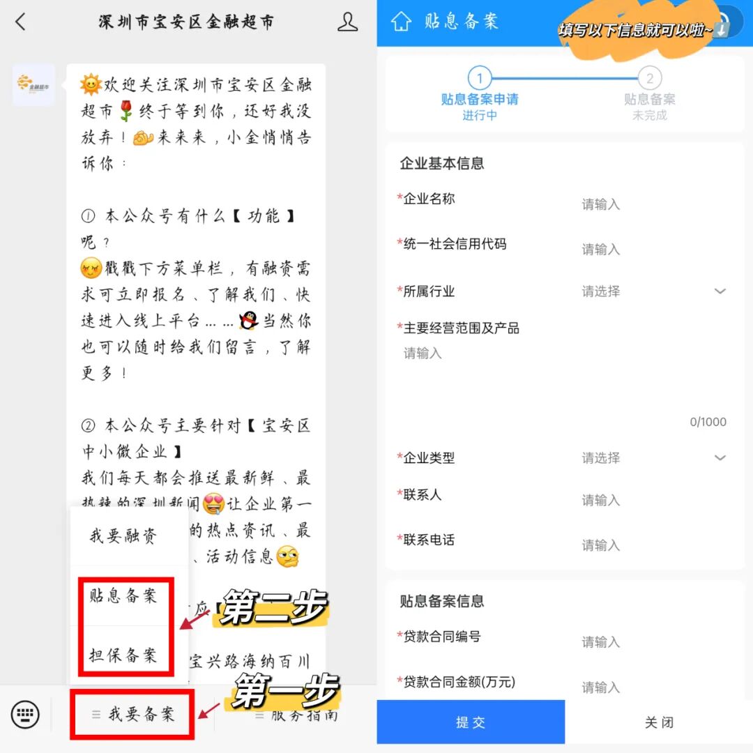关注“深圳市宝安区金融超市”微信公众号,点击“我要备案-贴息备案”
