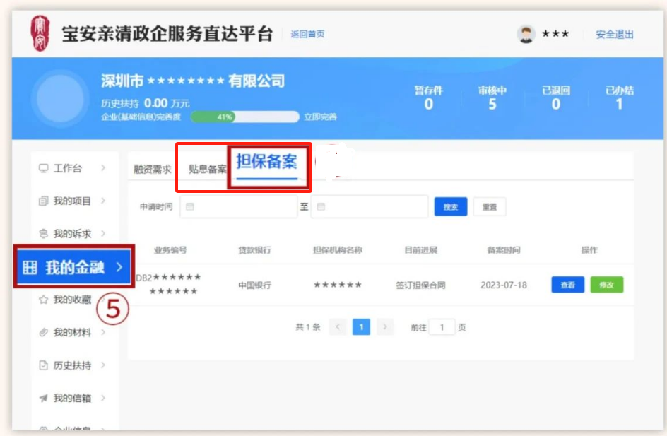 3、进入工作台后,点击“我的金融—贴息备案/担保备案”可看到已提交的备案