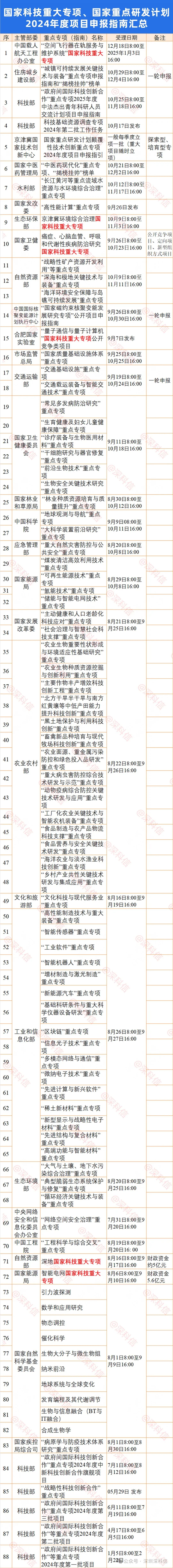 根据党中央、国务院关于科技计划管理改革的有关要求,国家重点研发计划重点专项、国家科技重大专项主责单位由科技部调整至各部委。现深科信将2024年度国家科技重大专项、国家重点研发计划申报安排汇总如下,供大家参考(具体以科技部国科管系统消息为准)。欢迎咨询深科信,了解更多项目资讯。
