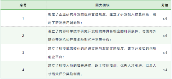 研究开发组织管理水平用于评价企业利用科技资源进行创新,经营创新和取得创新成果等方面的情况。根据《高新技术企业认定管理工作指引》,由技术专家根据企业研究开发与技术创新组织管理的总体情况,进行综合打分。