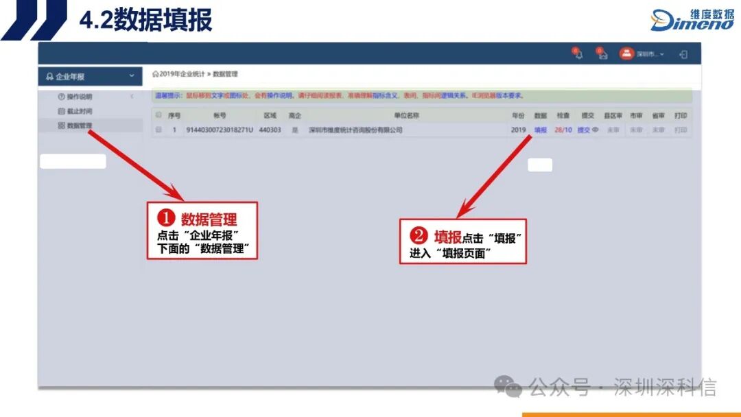 4、点击“企业年报”下面的“数据管理”,选择填报,进入填报页面