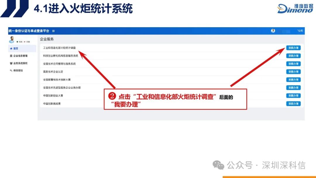 2、登录后,选择“工业和信息化部火炬统计调查”点击“我要办理“