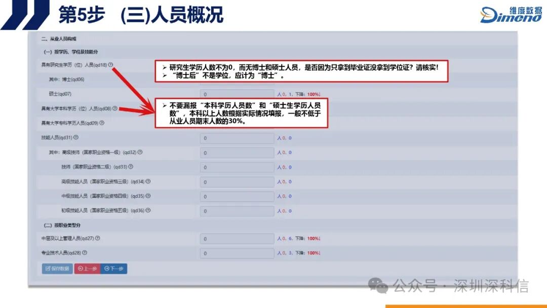 人员学历指标不要漏报! 具有大学本科学历(位)人员、具有研究生学历(位)人员、留学归国人员、外籍常驻人员等,本科以上全国平均40.9%