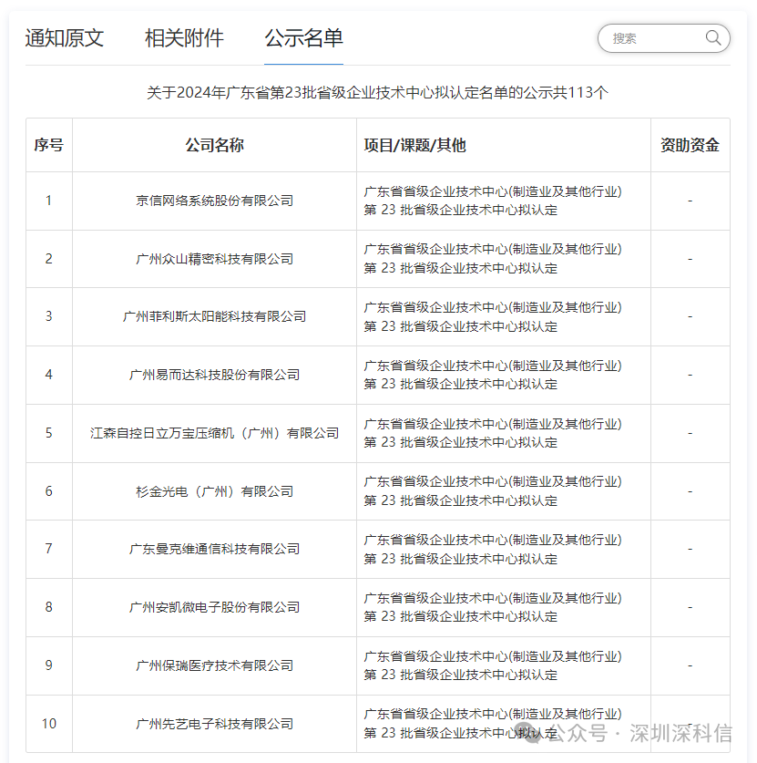2024年(第二十三批)广东省企业技术中心名单共113家通过,欢迎登录深科信官网查看名单