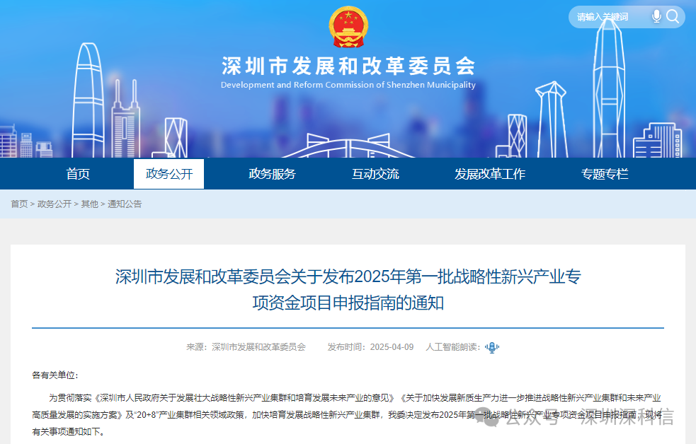 深圳市发展和改革委员会昨日发布了2025年第一批战略性新兴产业专项资金项目申报指南,共针对半导体与集成电路、生物医药、高端医疗器械、大健康、新能源、安全节能环保六个领域展开扶持,最高资助6000万!企业注意抓紧时间申报,欢迎咨询深科信,获取专属项目指导。