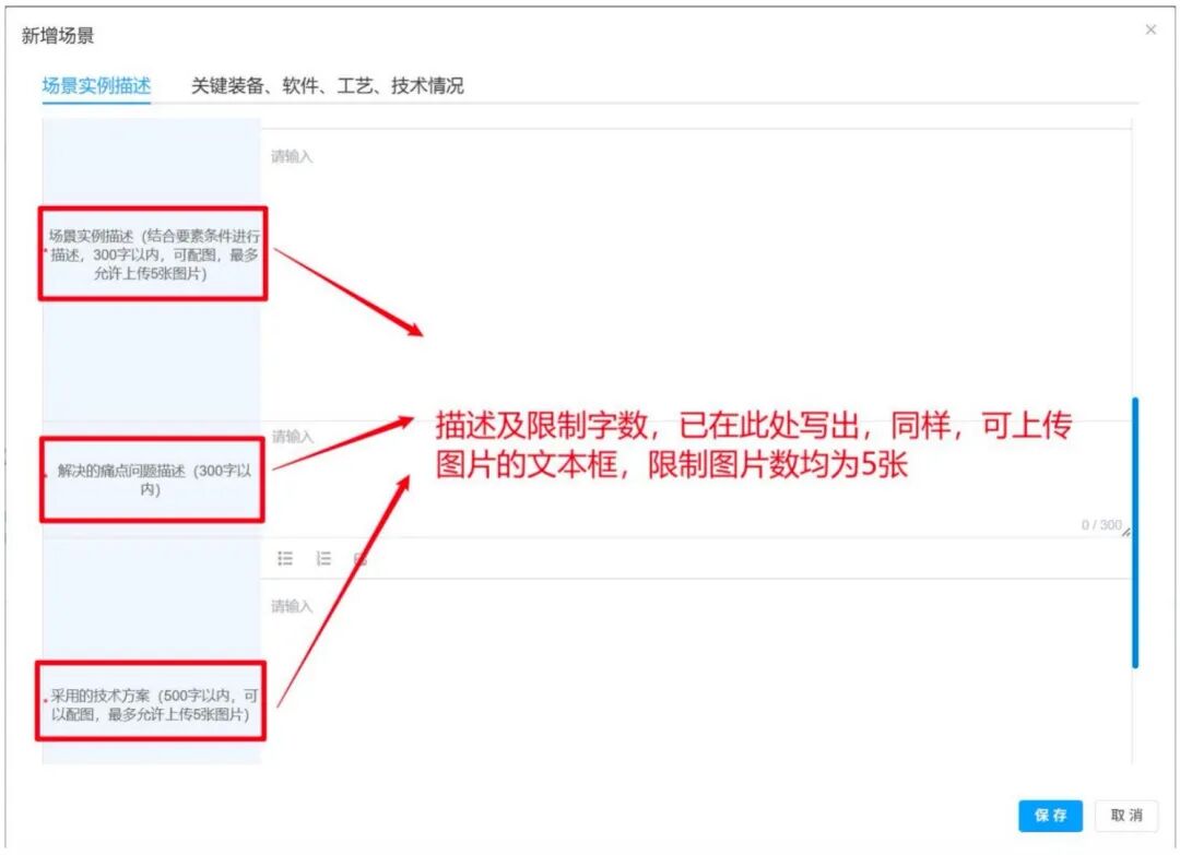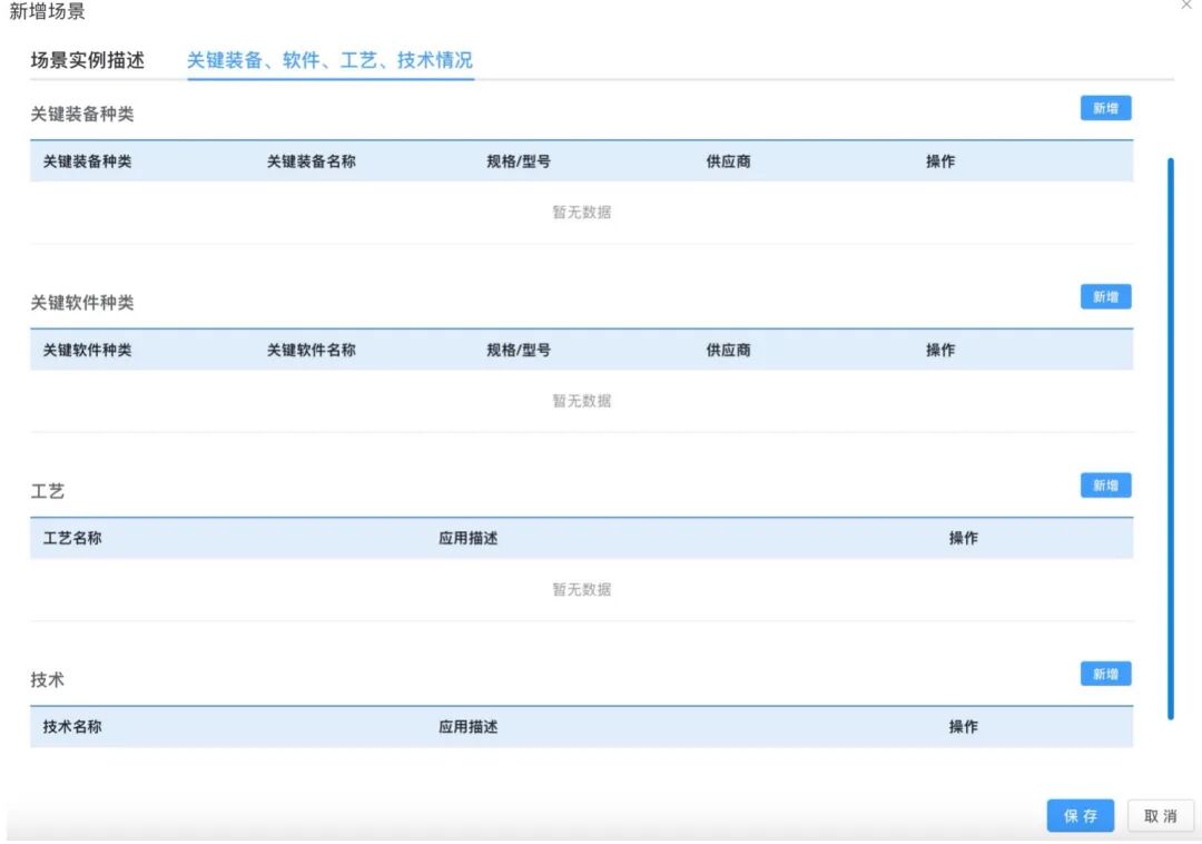 用户点击新增场景按钮,进入新增场景表单,表单中共分为场景实例描述和关键装备、软件、工艺、技术情况两个部分,前者中必填内容已在表格左侧以星号标出;后者为选填内容,用户根据该场景的建设情况进行填写即可。