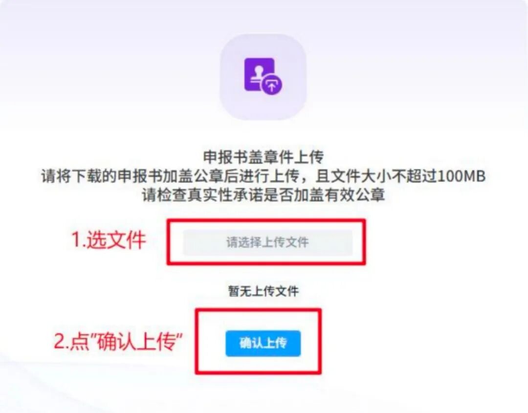 申报书盖章件上传中允许用户将相关文件上传至系统中,点击灰色的“请选择上传文件”,再将需要上传的内容进行选择即可,上传后,灰色框下方显示已上传的文件。若用户想要重新上传内容,再次点击灰框并进行选择即可,需注意用户上传的文件大小需不超过 100MB。