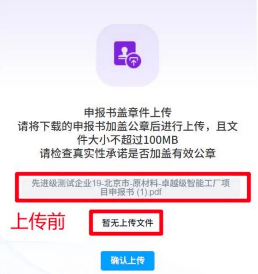 点击弹框的确认后,灰色框下方展示用户已上传的申报书盖章件相关文件名。