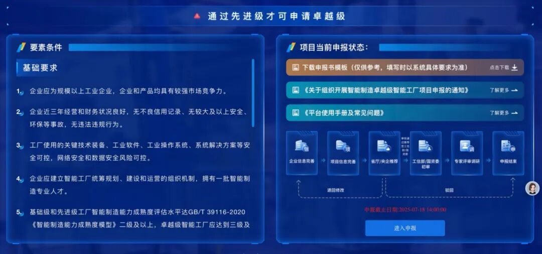 根据通知文件要求,申报主体参考《智能制造典型场景参考指引(2025年版)》及《智能工厂梯度培育要素条件》,按照《卓越级智能工厂项目申报材料清单》(附件2)编制申报书,于2025年7月18日前完成线上申报。申报主体对申报内容真实性负责,并确保申报材料不涉及国家秘密、商业秘密。