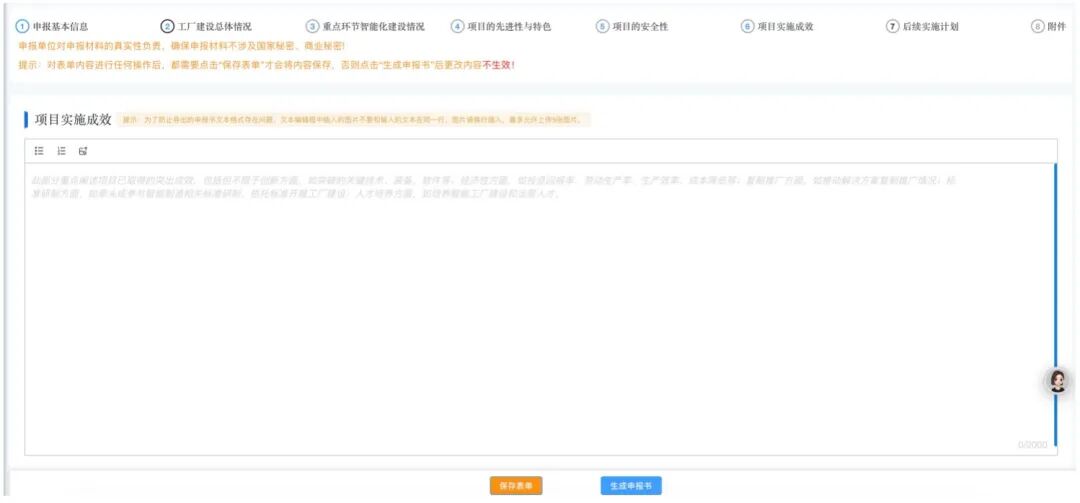 该部分旨在重点阐述项目已取得的突出成效,包括但不限于创新方面,如突破的关键技术、装备、软件等;经济性方面,如投资回报率、劳动生产率、生产效率、成本降低等;复制推广方面,如推动解决方案复制推广情况;标准研制方面,如牵头或参与智能制造相关标准研制、依托标准开展工厂建设;人才培养方面,如培养智能工厂建设和运营人才,为必填项。用户可输入不超过 2000 字的内容,同时可插入不超过 5 张图片,每张图片大小均不超过 15MB。填写完毕后点击保存表单即可保存相关内容。