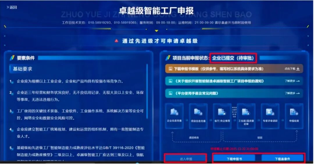 此时用户点击卓越级下方的进入申报后,卓越级首页中的状态变为“企业已提交(待审批)”,说明用户已完成提交,此时,进入申报按钮置灰不可点击,用户可下载申报书及其盖章件。