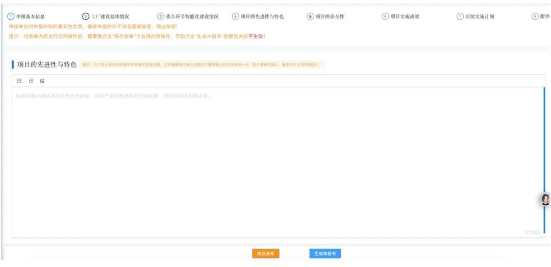 该部分旨在阐述工厂使用的关键技术装备、工业软件、系统解决方案,以及网络安全和数据安全风险可控等方面阐述项目的安全性,为必填项。用户可输入不超过 1500 字的内容,同时可插入不超过 5 张图片,每张图片大小均不超过15MB。填写完毕后点击保存表单即可保存相关内容。