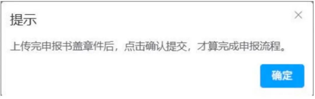 申报书盖章件上传成功后,系统会进行弹框提示,告知用户在上传完申报书盖章件后,点击确认提交,才算完成申报流程。