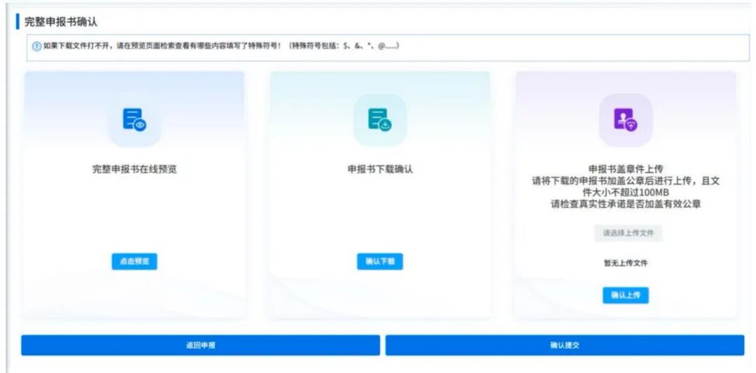 该页面中共有五个功能,分别是完整申报书在线预览、申报书下载确认、申报书盖章件上传、返回申报和确认提交。用户若需完善填报内容,可点击返回申报按钮,重新跳转回申报页面,若全部填写完成,并已经生成过申报书,可保存后重新点击生成申报书跳转至上述页面。