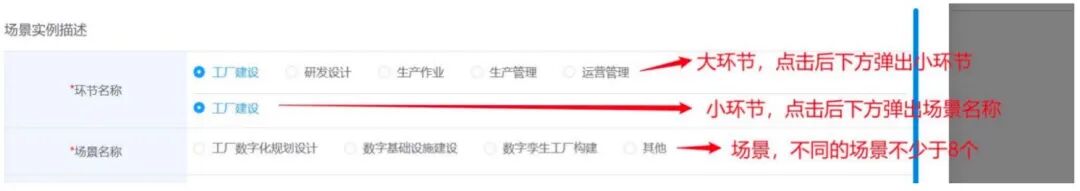 场景实例描述中的环节和场景,分为大环节、小环节和场景,其中,先点选大环节后,小环节在下方弹出,再点击小环节,下方弹出场景。