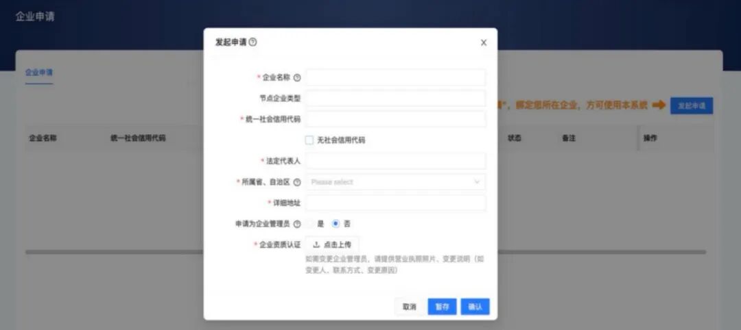 申请时需要上传相关企业资质认证证明材料,如果申请成为“企业管理员”,将会承担后续其他申请关联本企业的审核工作。
