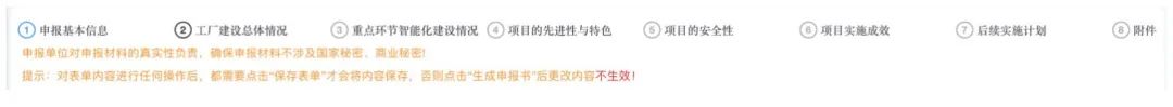 进入申报页面后,可见本系统共有申报基本信息、工厂建设总体情况、重点环节智能化建设情况、项目先进性与特色、项目的安全性、项目实施成效、后续实施计划和附件 8 个部分。