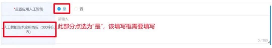 下方必填内容中,若用户在“是否应用人工智能”部分点选了是,则其下方会弹出一个人工智能技术应用情况的填写框,用户需填写不超过 300 字的描述。
