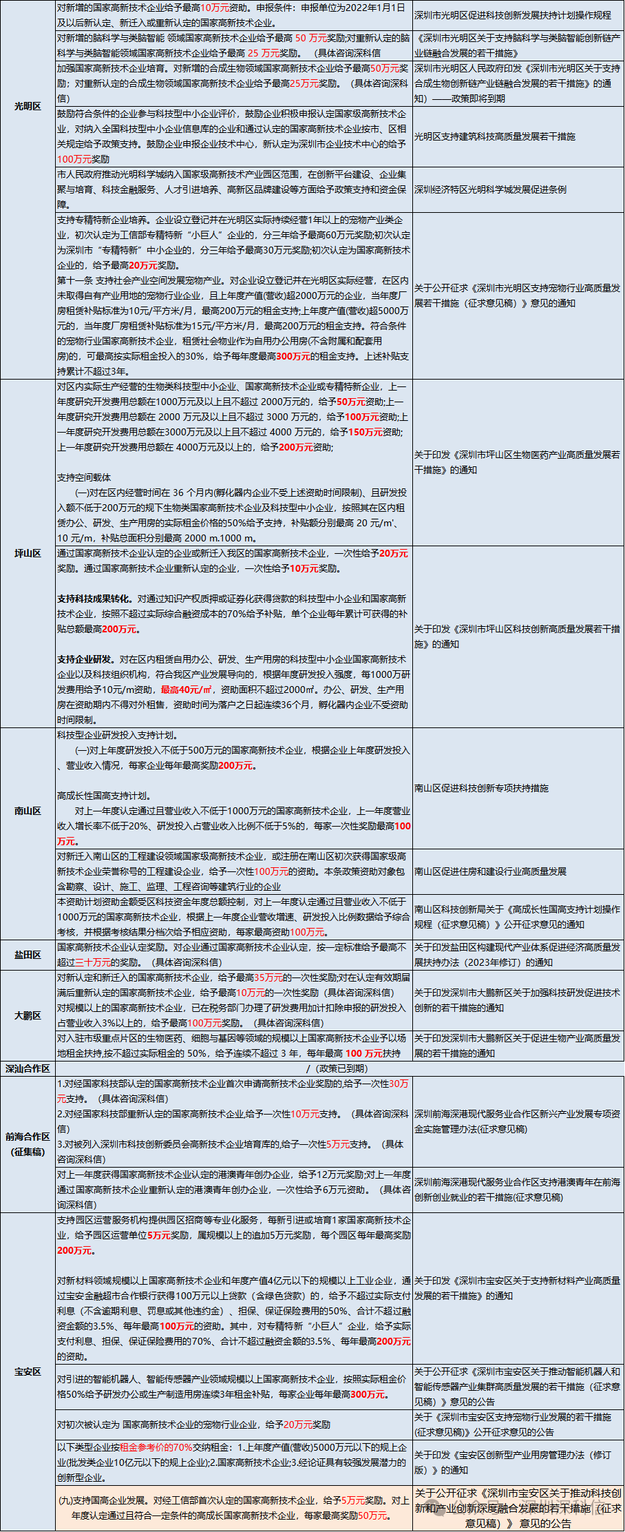 (点击查看大图) 申报好处多多 二、国家高新技术企业 深圳市及各区补贴情况表