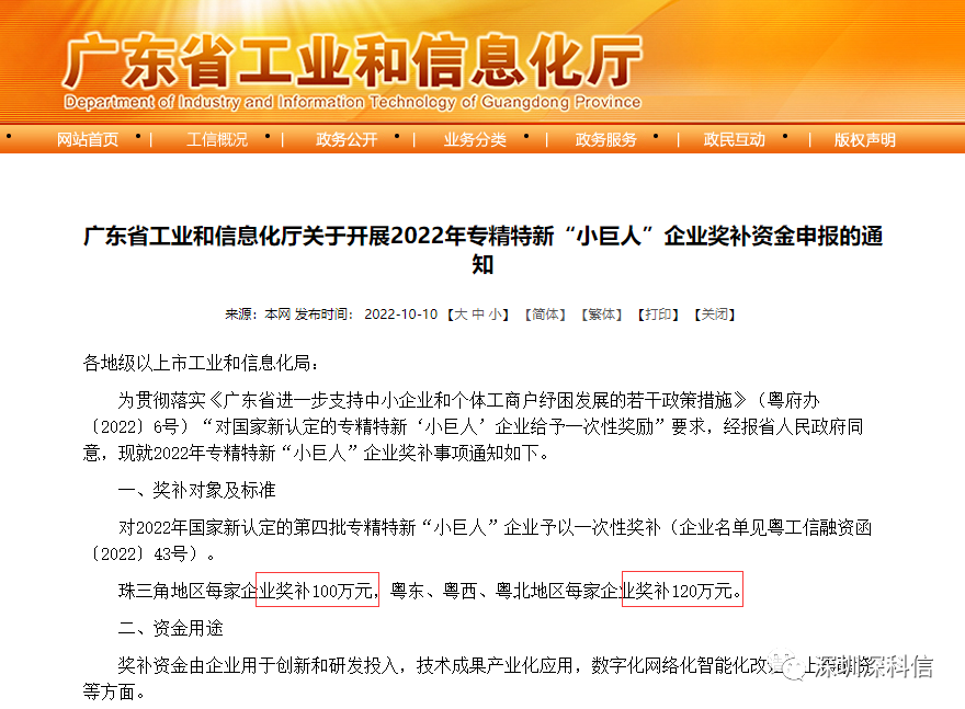 刚刚,广东省工业和信息化厅发布2022年专精特新“小巨人”企业奖补资金申报的通知,完整内容请咨询深科信!