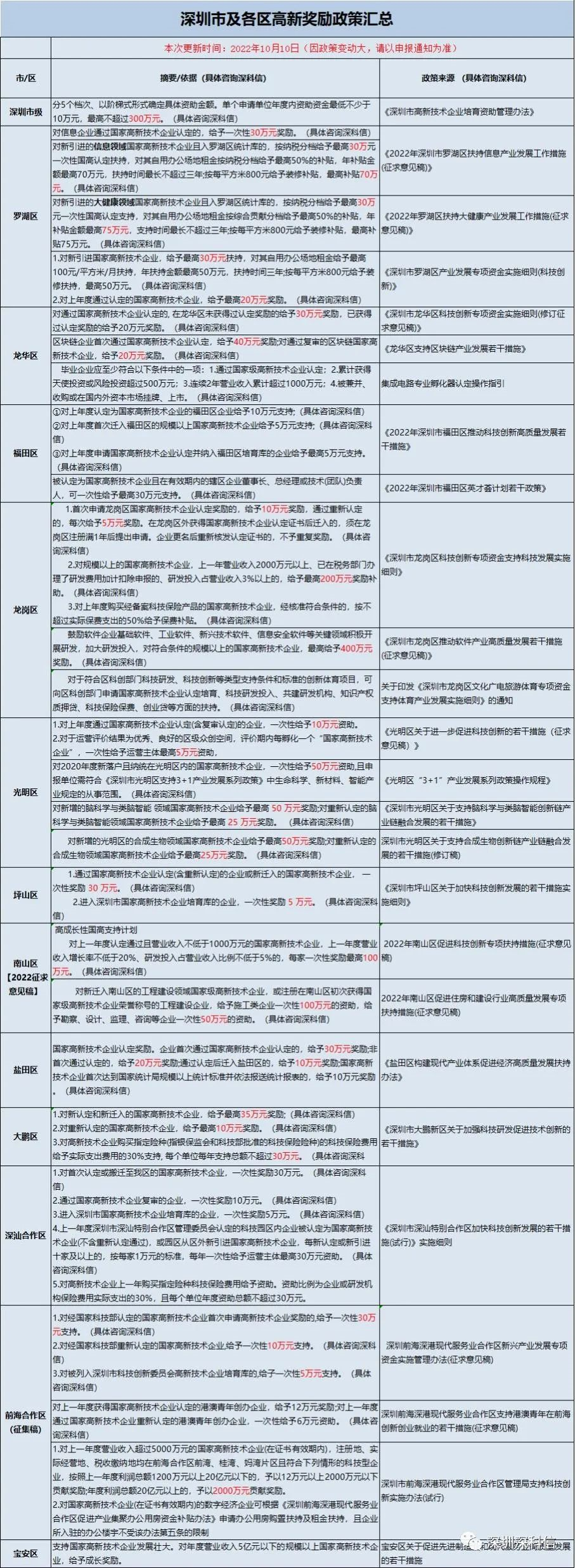 高企通过当年即可享受减免40万的优惠,三年就可减免120万税收。如果您觉得自主申报没有把握,时间成本和人力成本太高,推荐找深科信来代理申报服务。下面是深科信整理的各区补贴汇总表: