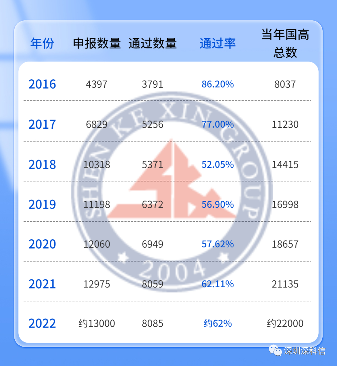 2022年深圳市共有13000多家企业申报高新技术企业认定,其中仅8085家企业通过,通过率为62%